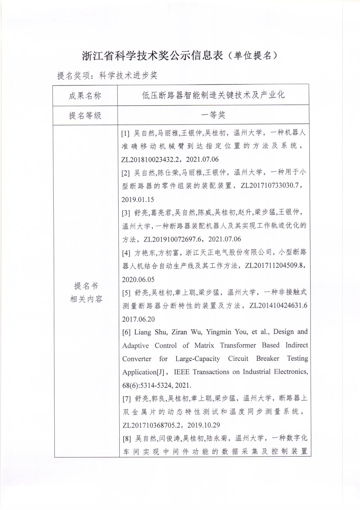 根據(jù)《關(guān)于開展 2021 年度浙江省科學技術(shù)獎提名工作的通知》要求,現(xiàn)對我司吳桂初、陳仕榮、梁步猛同志參與的2021年度浙江省科學技術(shù)獎項目《低壓斷路器智能制造關(guān)鍵技術(shù)及產(chǎn)業(yè)化》予以公示,公示期為7個工作日(即自2022年2月24日至2022年3月3日)。